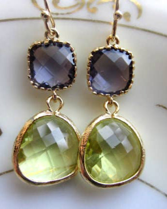 The peridot glass gems are 16k gold plated and measure approximately 13mm with 5mm at the thickest part. The tanzanite square blocks measure 9mm with 3mm thickness and are gold plated. The earwires are 14k gold filled. The length of the earrings is approximately 1.5 inches.