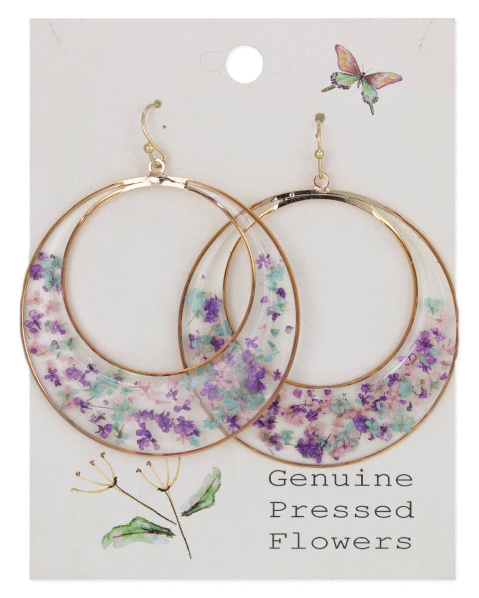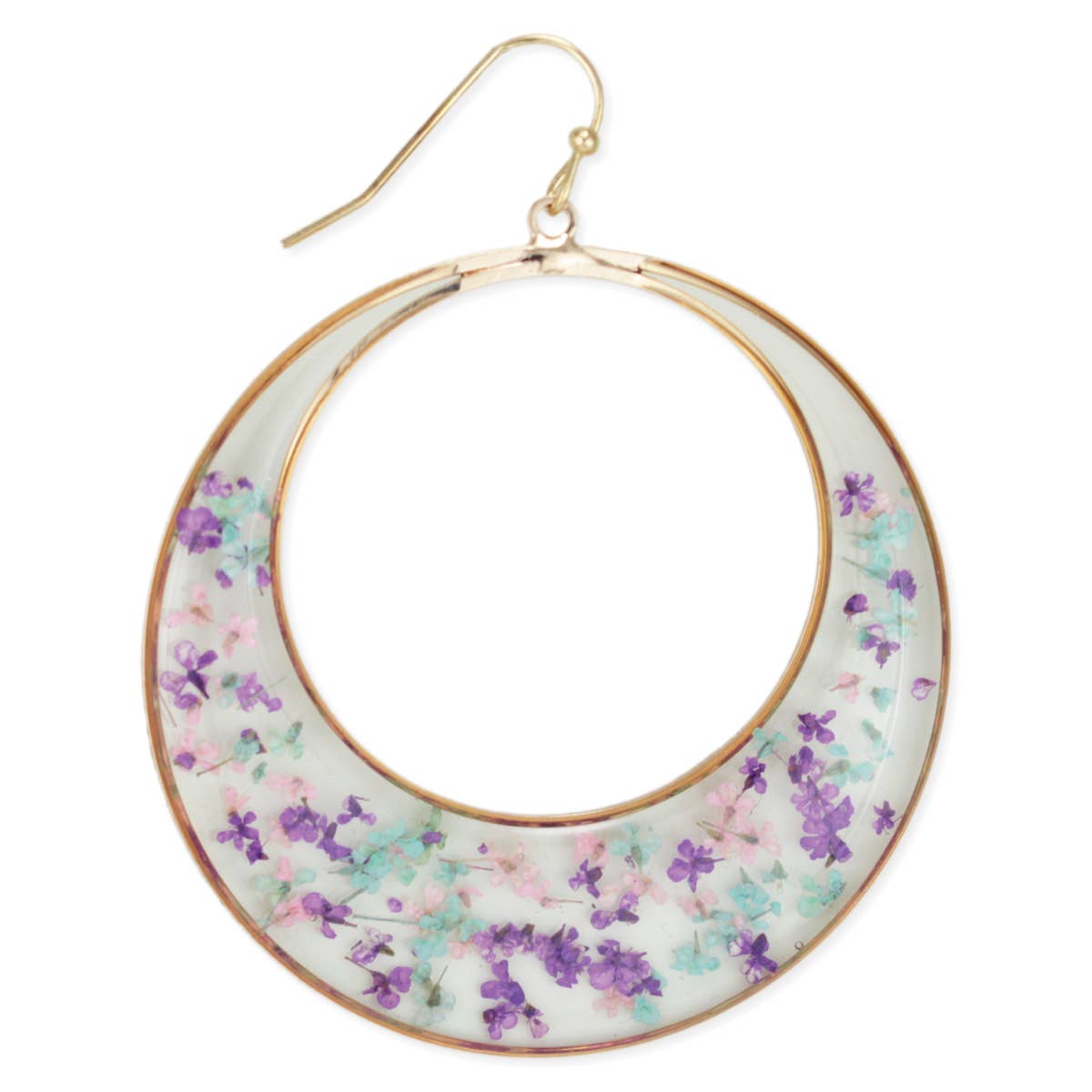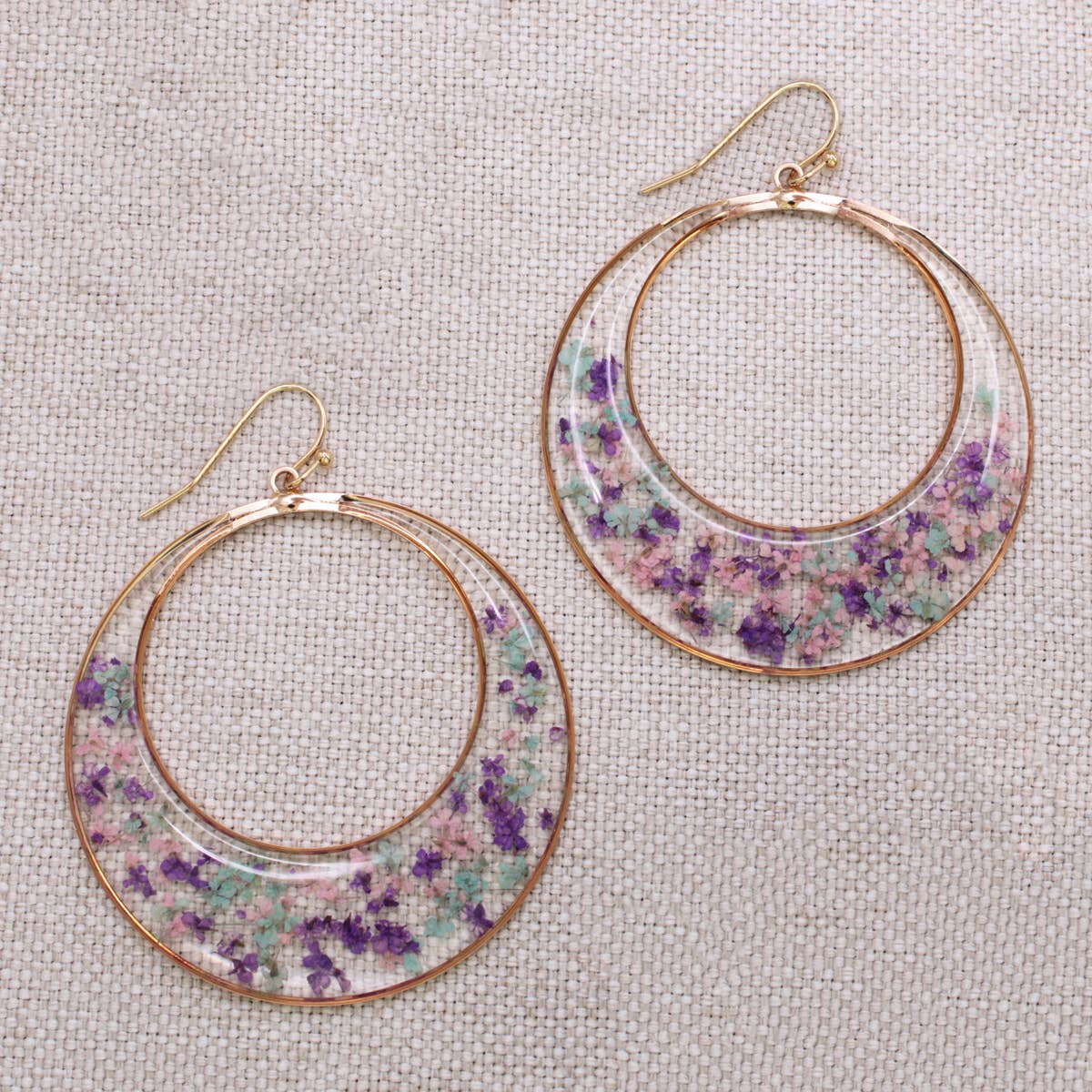 Vibrant and playful, these floral statement earrings feature real pink, purple, and mint-toned dried flowers preserved in clear resin. The circular shape and crescent detail add movement and charm, perfect for days you want to bloom a little brighter.