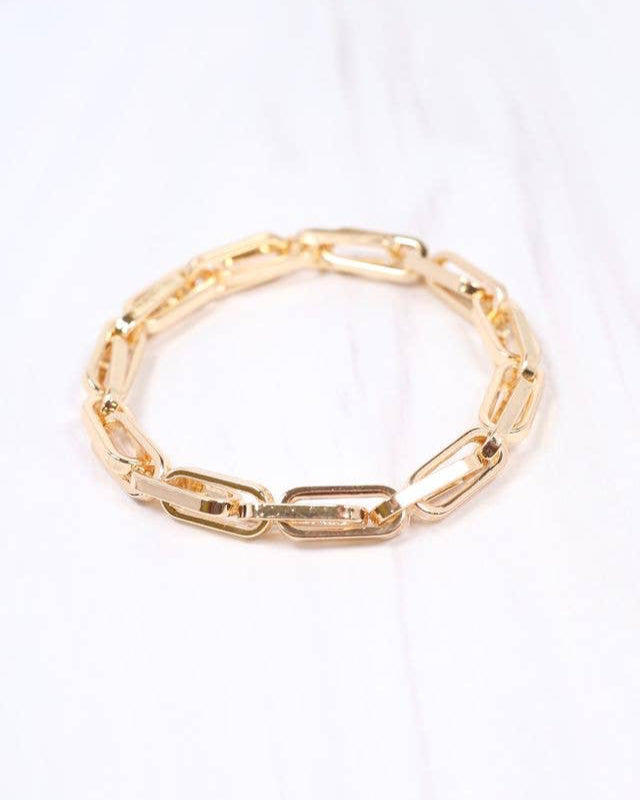 This simple bracelet is made with interlocking links with a shiny metal finish. It's a great size to wear by itself or in a fuller stack for a different look. Stretches to fit most wrists.