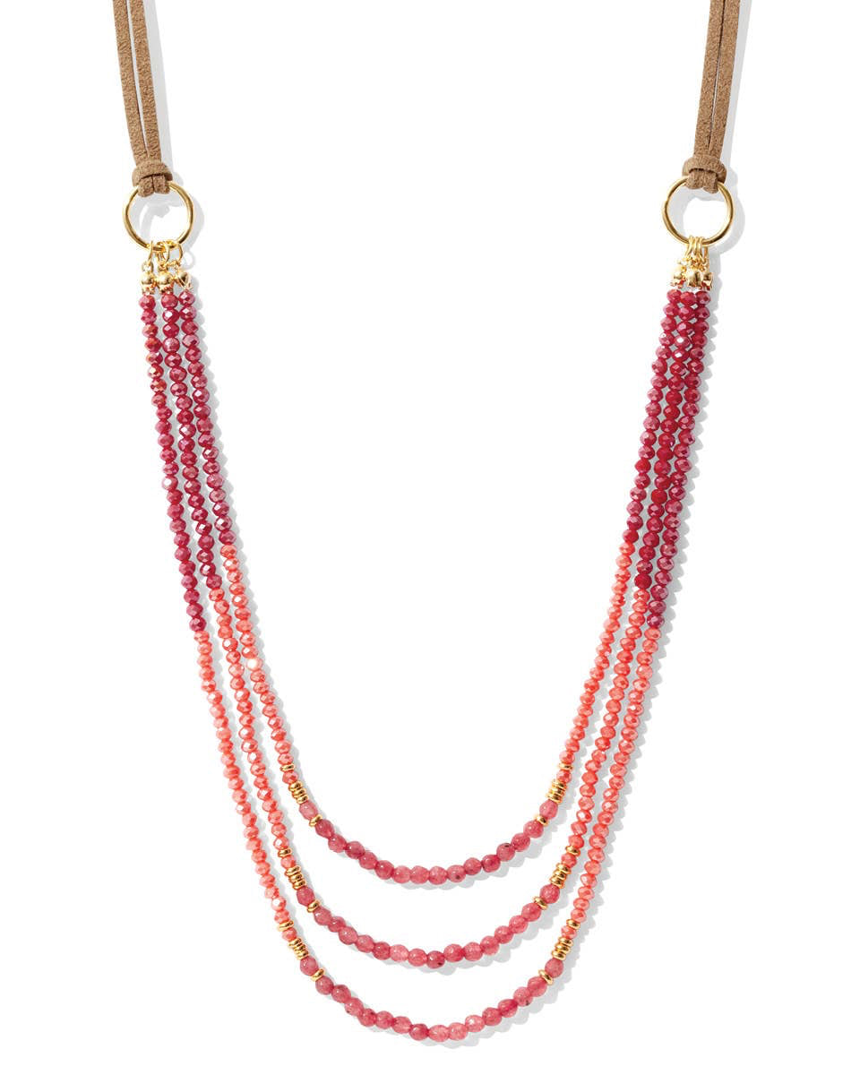This triple-layer necklace blends stones, glass crystals, and gold-toned beads into a dreamy design with soft faux suede sides for comfort and style. The pink tones bring a playful yet polished feel.