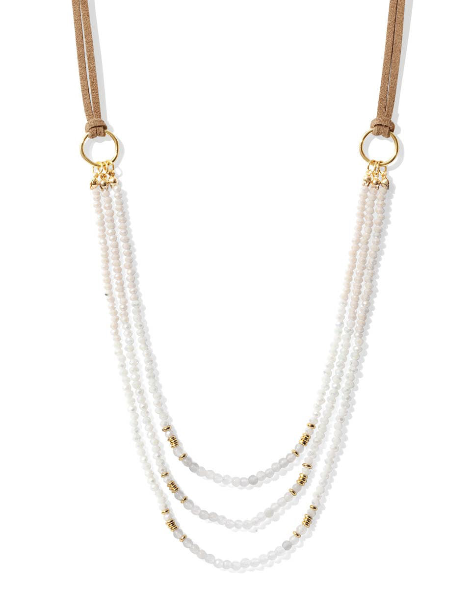 White, gold, and shimmer come together in this layered necklace with natural stone and crystal accents. With suede sides and a relaxed drape, it’s made for effortless beauty.