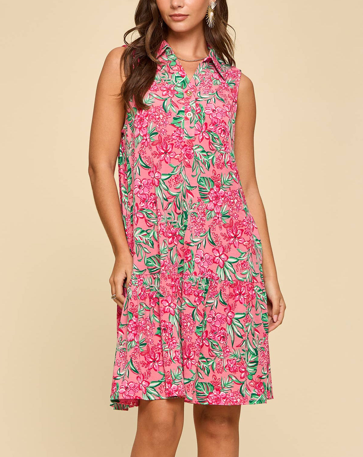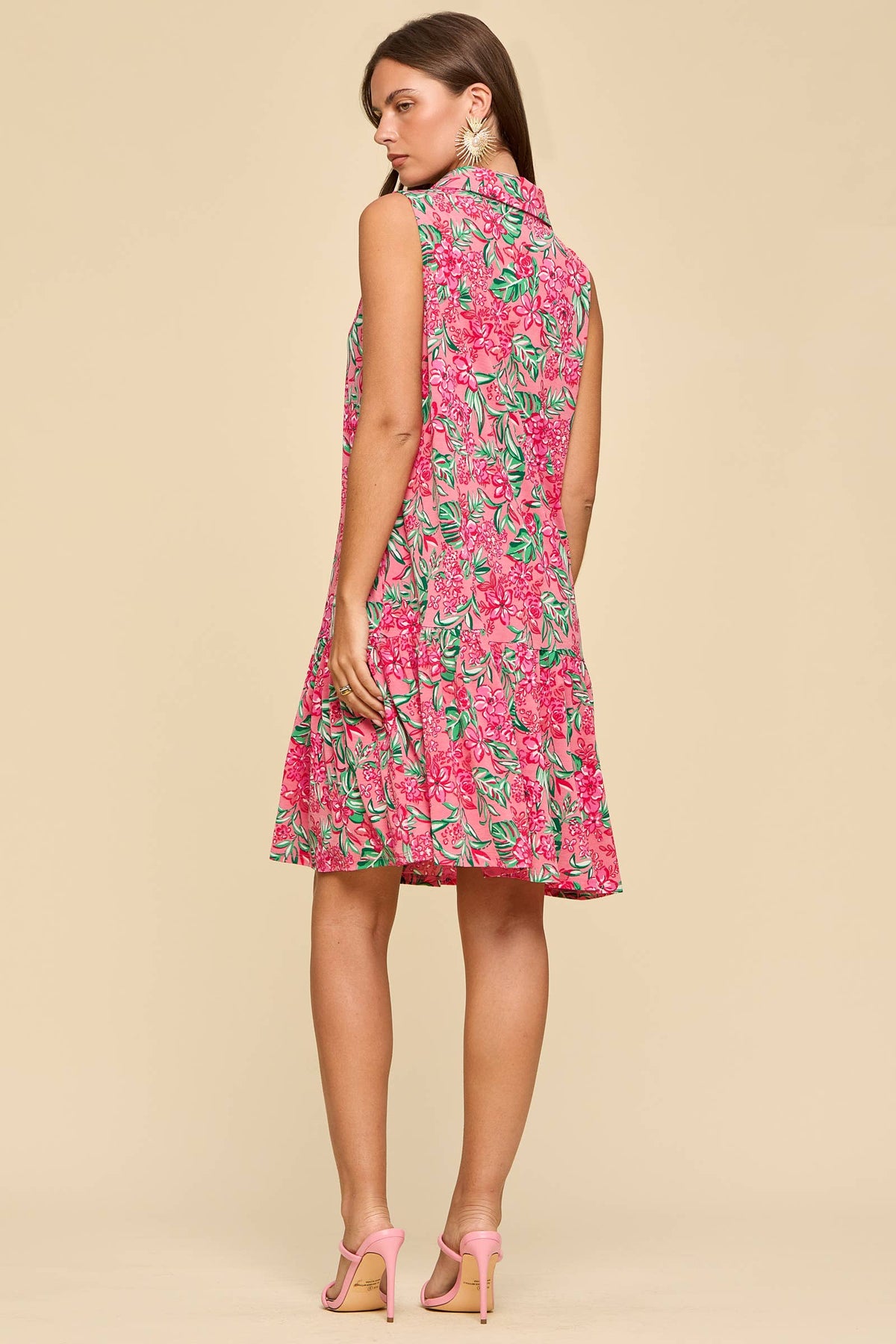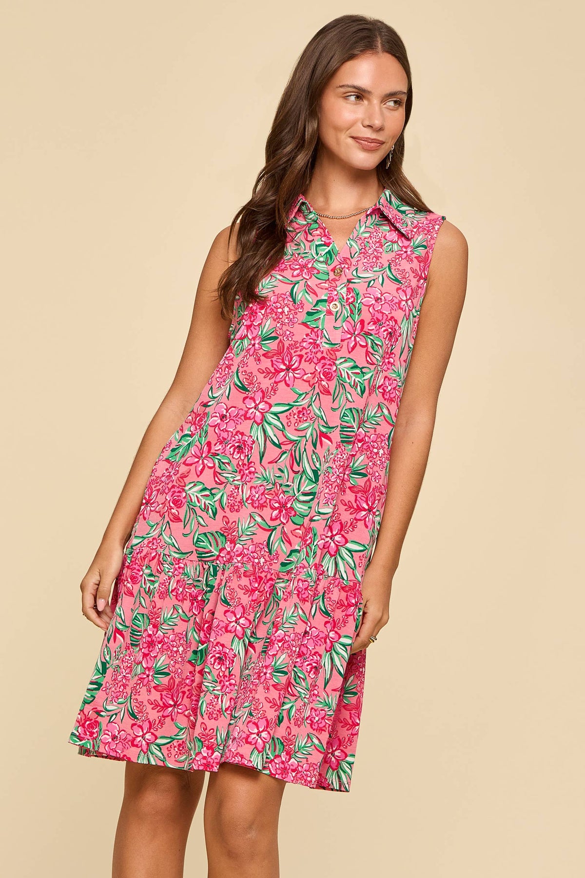 Playful, feminine, and perfect for sunny days, this sleeveless collared dress brings a bright pop of color to your wardrobe. The vibrant pink floral print feels fresh and lively, while the structured collar and button placket add a polished touch. Designed with a relaxed fit and a flouncy tiered skirt, it’s an easy piece that moves beautifully with you.
