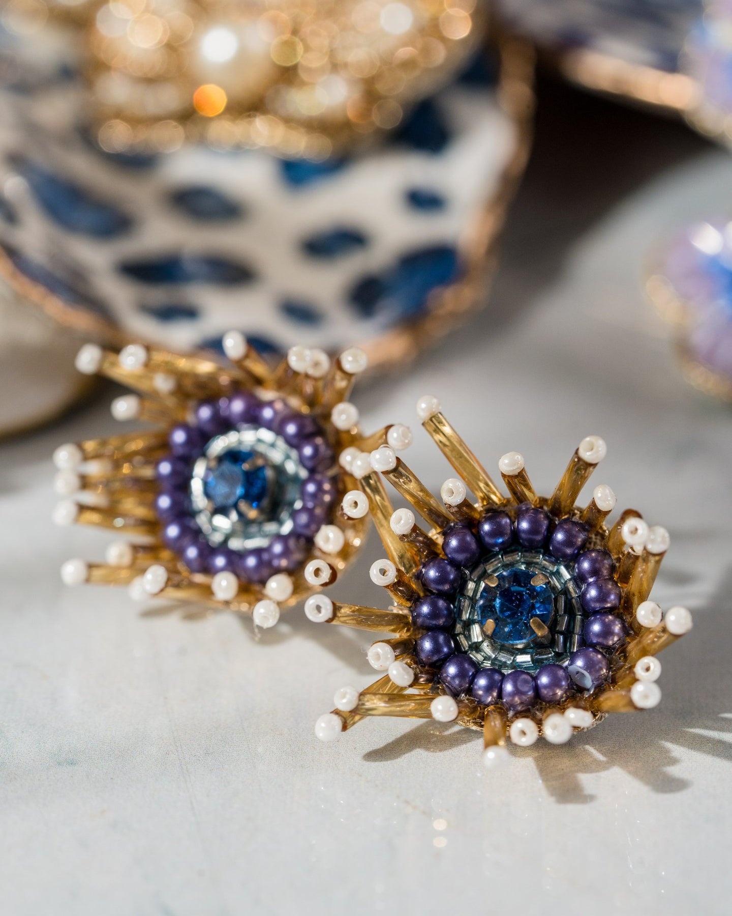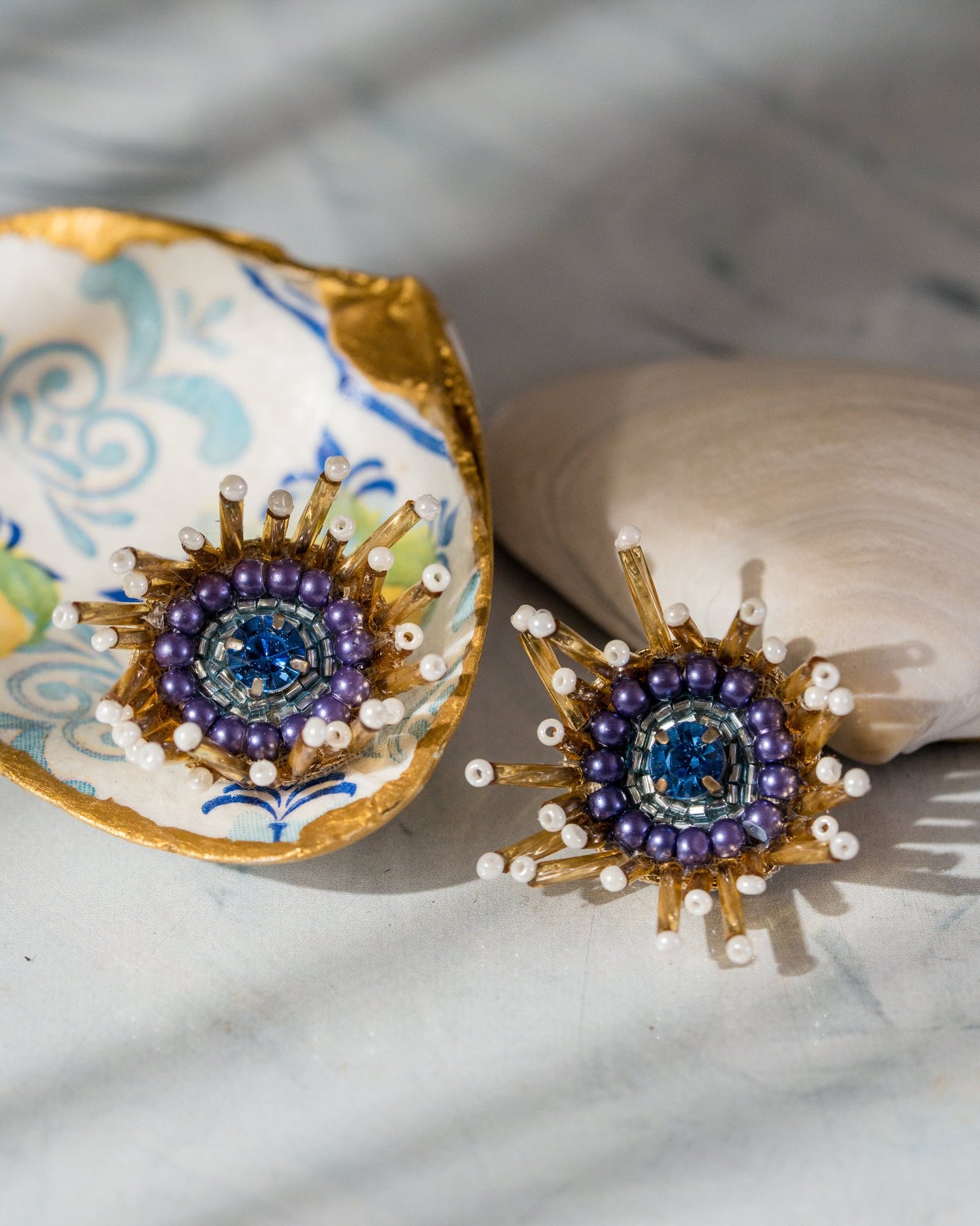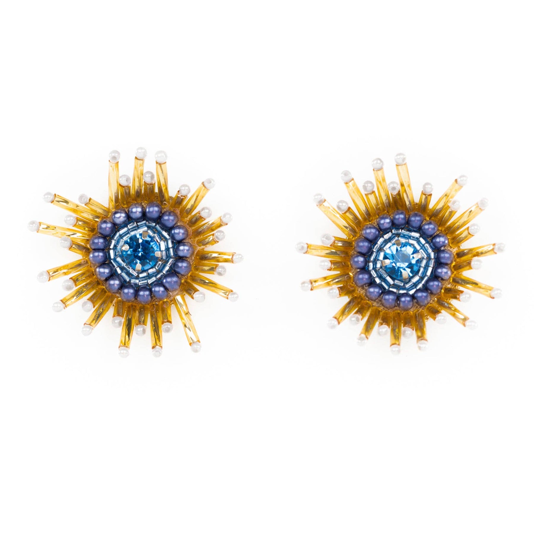 Add a pop of playful texture to your look with these bold blue sunburst earrings. The intricate beaded design brings a touch of boho-chic energy to your outfit, whether you're heading to brunch or a boardwalk stroll.