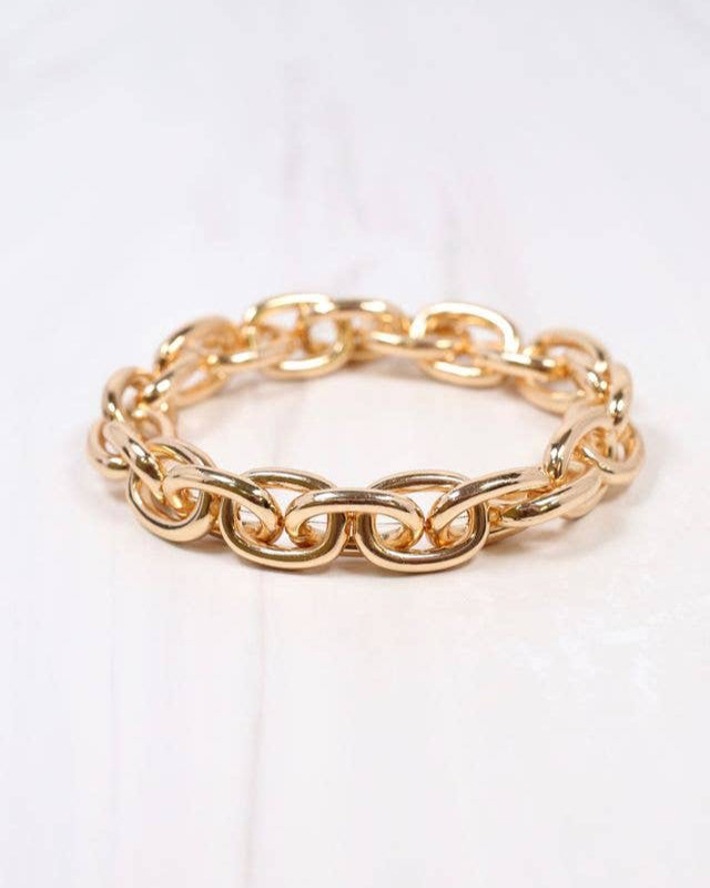 This simple bracelet has interlocked links and stretches to fit most wrists. Wear alone or in a stack with other bracelets.