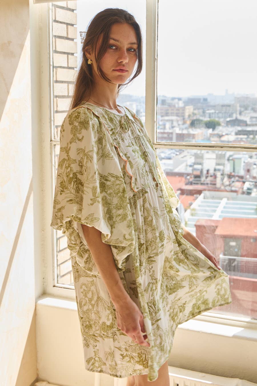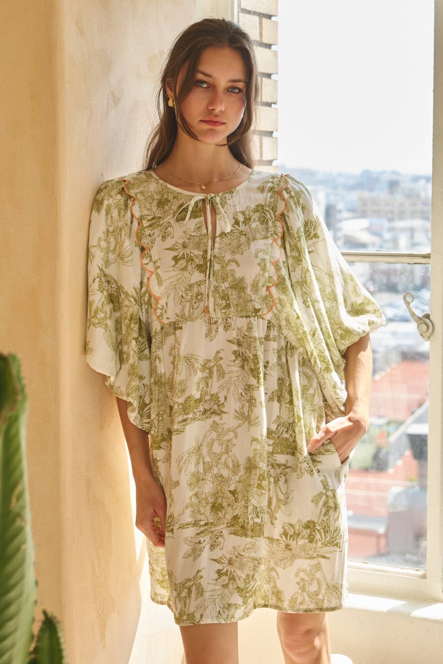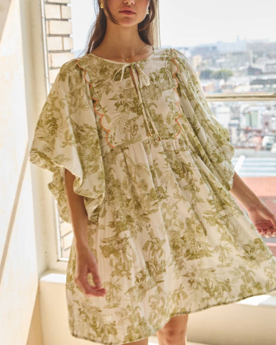 Soft, airy, and effortlessly feminine, this printed mini dress brings a relaxed elegance to everyday dressing. The olive-toned toile-inspired print adds a timeless, vintage feel, while the flowy silhouette and scalloped contrast detailing create just the right amount of visual interest. It’s an easy piece for warm days… equally at home with sandals for brunch or dressed up with wedges for a casual evening out.