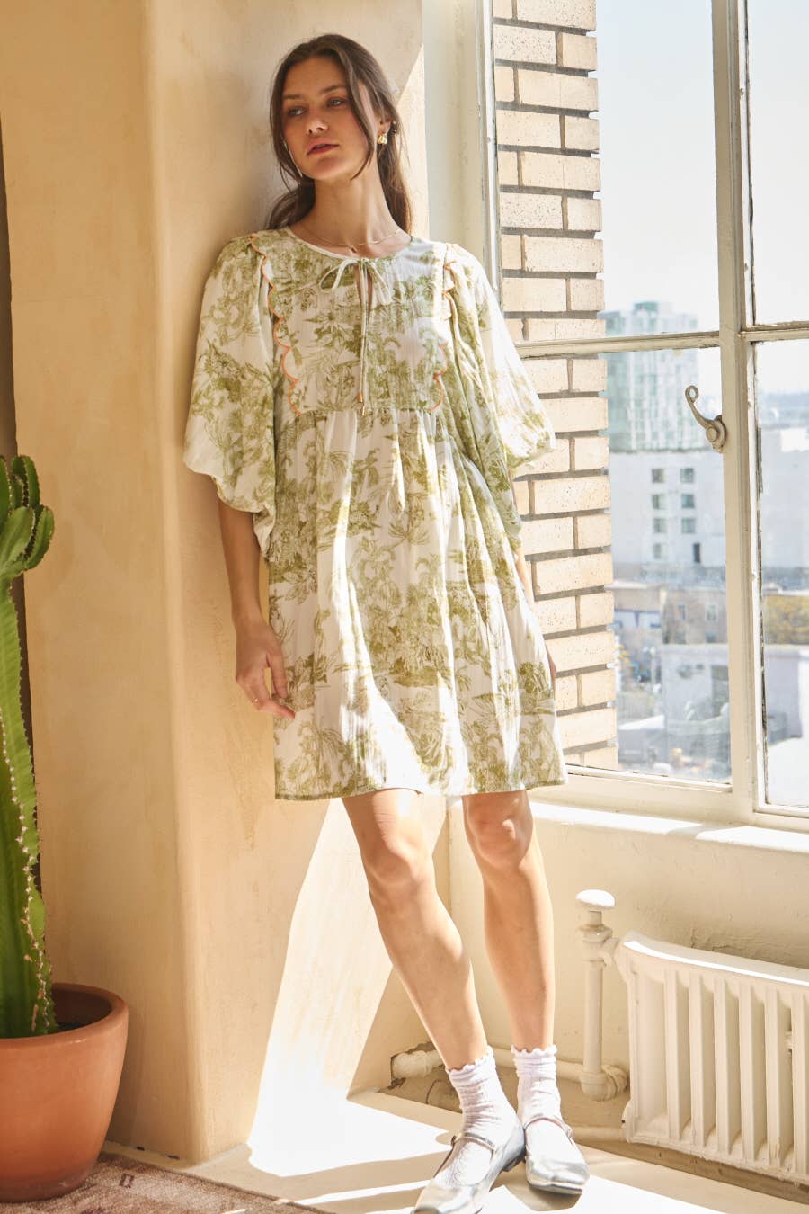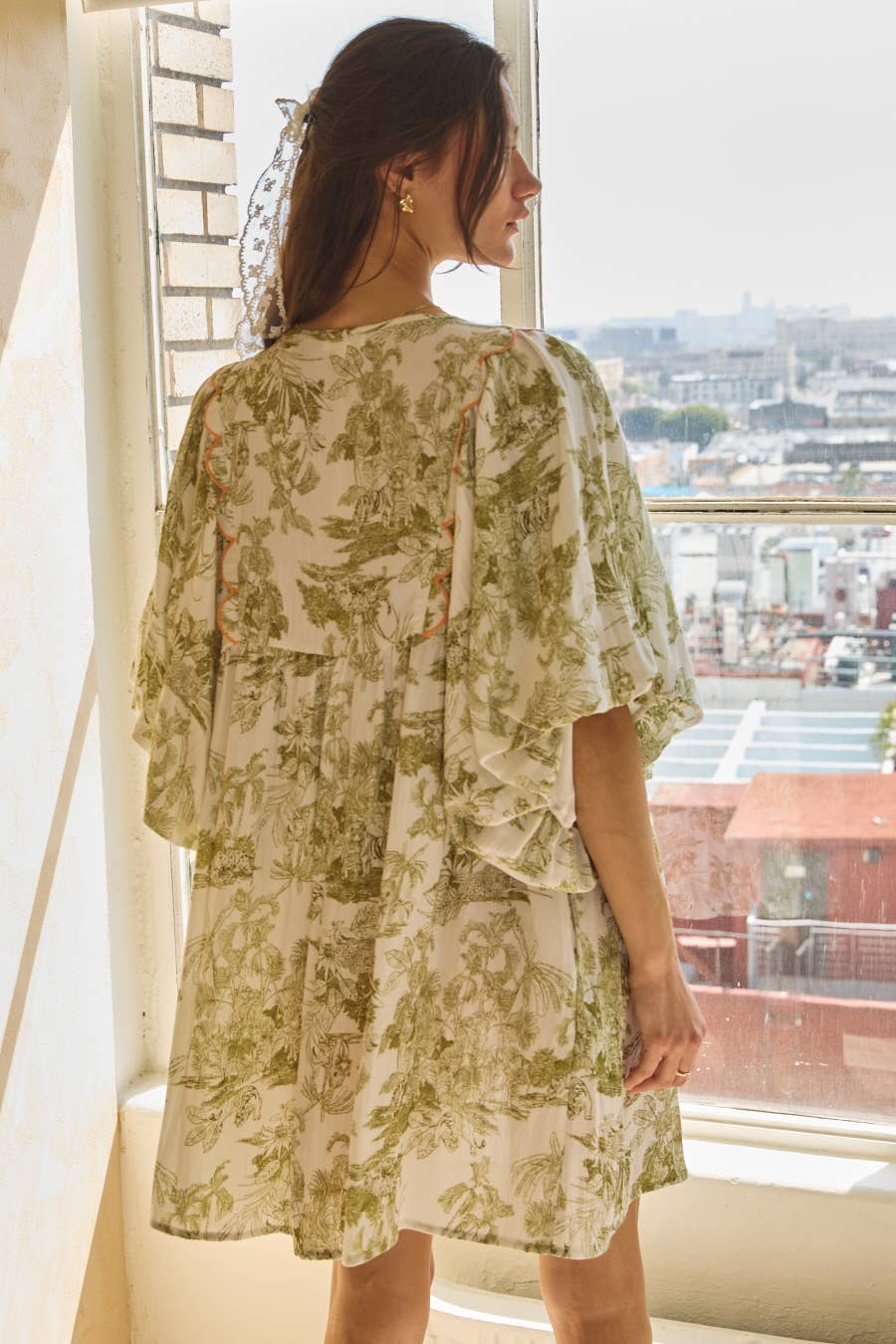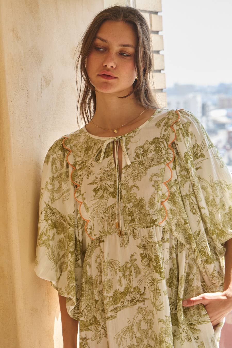 Soft, airy, and effortlessly feminine, this printed mini dress brings a relaxed elegance to everyday dressing. The olive-toned toile-inspired print adds a timeless, vintage feel, while the flowy silhouette and scalloped contrast detailing create just the right amount of visual interest. It’s an easy piece for warm days… equally at home with sandals for brunch or dressed up with wedges for a casual evening out.