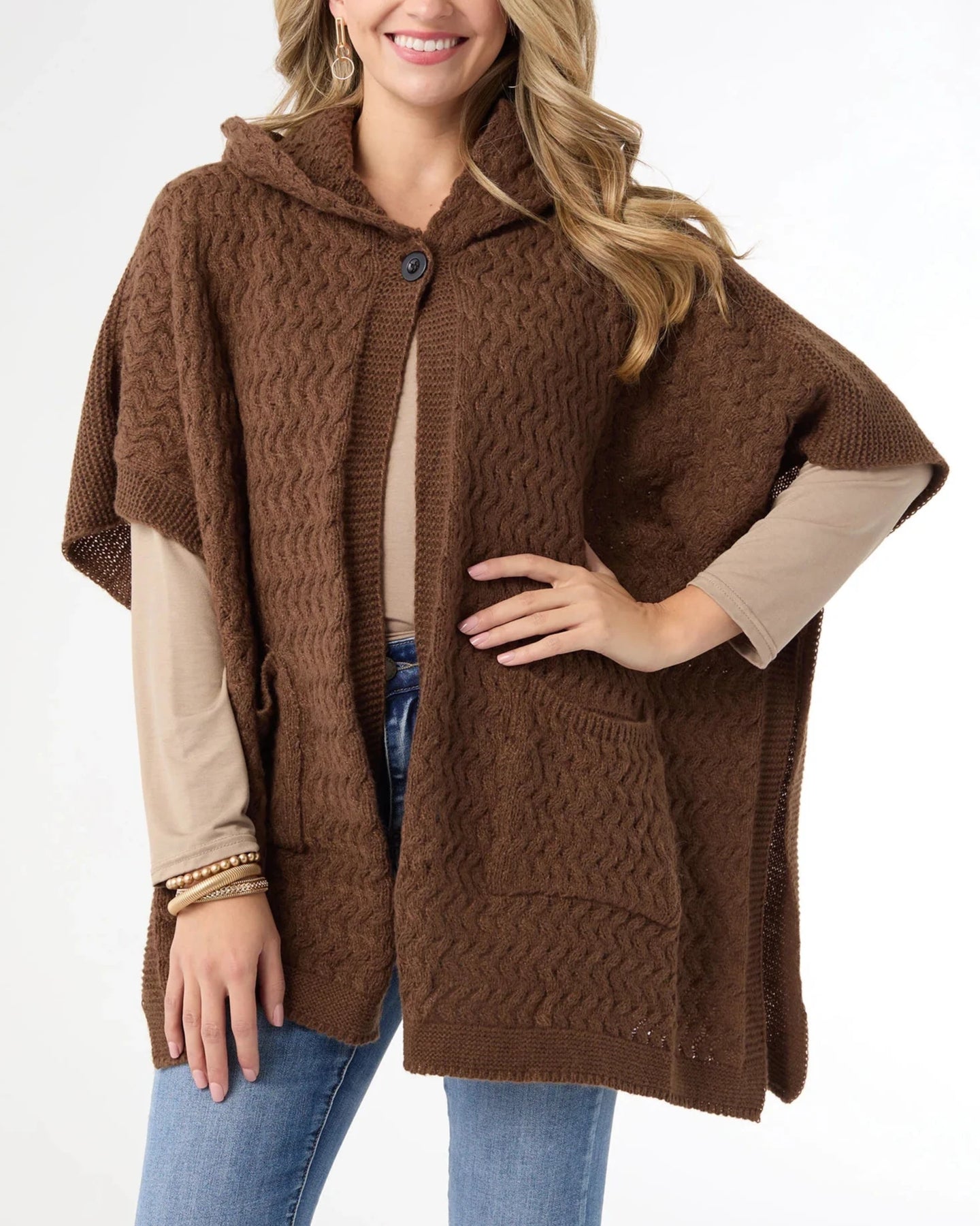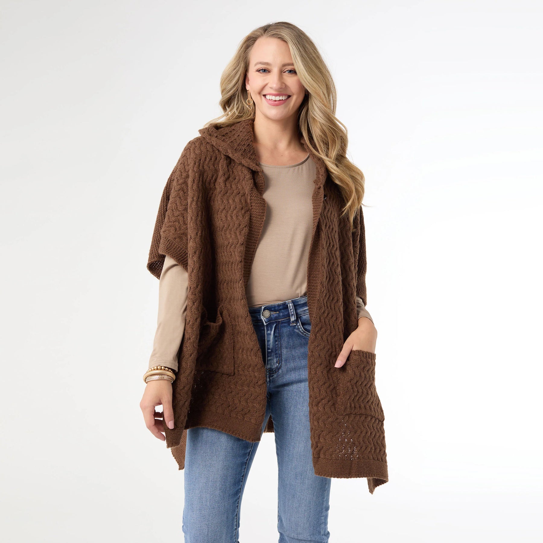 Equal parts cozy and chic, the Whitley Hooded Poncho is your everyday answer to fall layering. With a roomy hood, soft drape, and front pockets for chilly hands or small essentials, it’s made for everything from coffee runs to cozy nights in. The rich chocolate hue adds a warm, seasonal touch to any outfit.