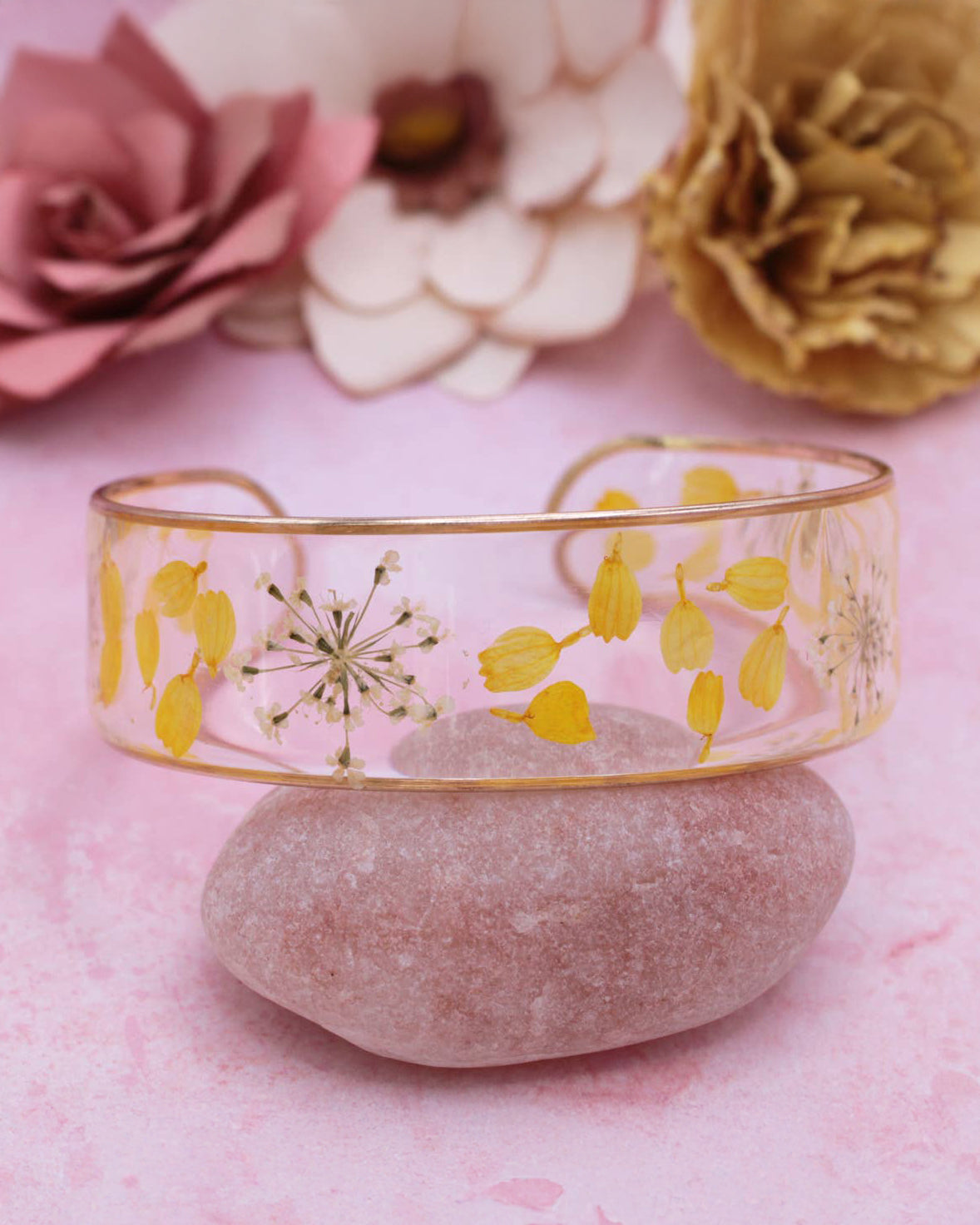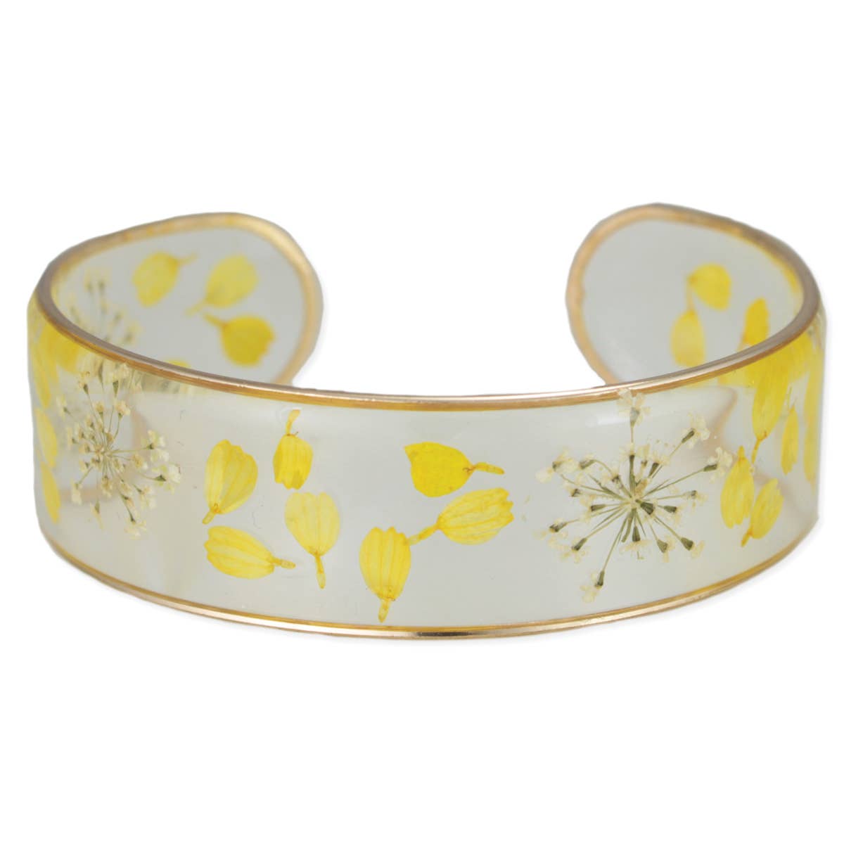 A garden on your wrist—this wide clear cuff showcases delicate yellow and white dried flowers preserved inside transparent acrylic. Framed in gold-tone metal, the vibrant florals seem to float, offering a fresh, nature-inspired twist to your look. Lightweight and full of charm, it's a true statement piece for flower lovers.